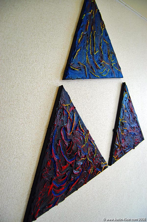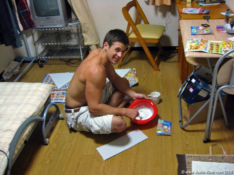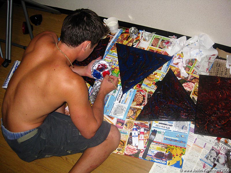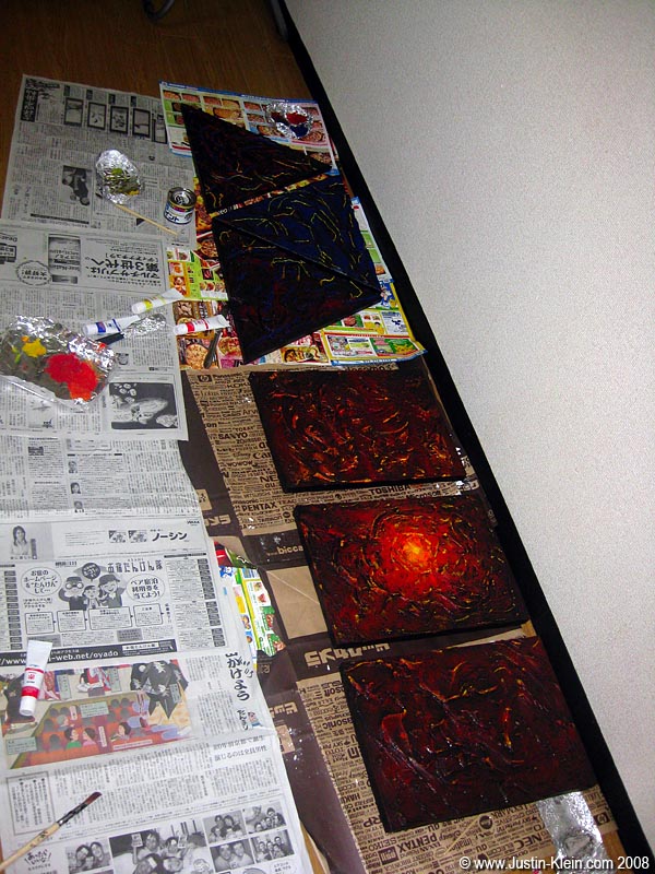 Here are my latest, ehrm, first painting creations: decorations to complement the fantastically interesting rice cooker, TV/VCR combo, and clothes rack in my Summer bachelor pad in Kyoto.