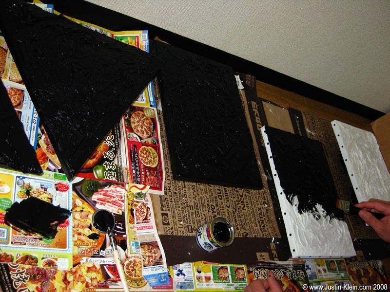 1) Trip to the 100 yen shop. 3 triangular canvases, 1 bag plaster, 1 large paintbrush, 1 set small brushes, 1 can black paint, 3 tubes color paint. Total: $14 (the canvases were a bit more expensive).