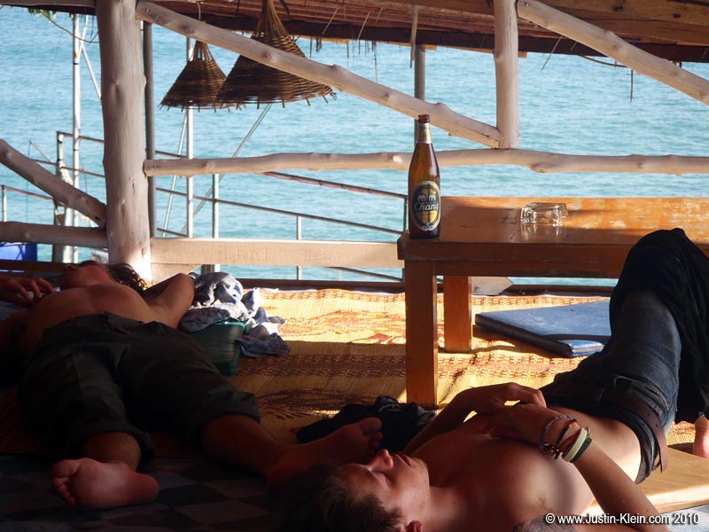 We met up with Sarah at a bar called Rasta, an isolated little establishment buried deep in the jungle. Just finding the place was an adventure, and the bar itself felt like something out of a movie. In the bathroom, a tarantula the size of my hand crawled slowly up the wall. Thai hippies with dreadlocks down to their belts sat lazily smoking their joints, as Bob Marley looped endlessly in the background. It was definitely more like the Haadrin we’d seen early in the day than the alcohol-fueled insanity of night. In a word, chill. Very chill.
