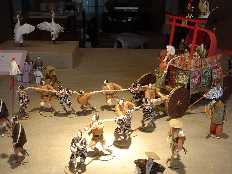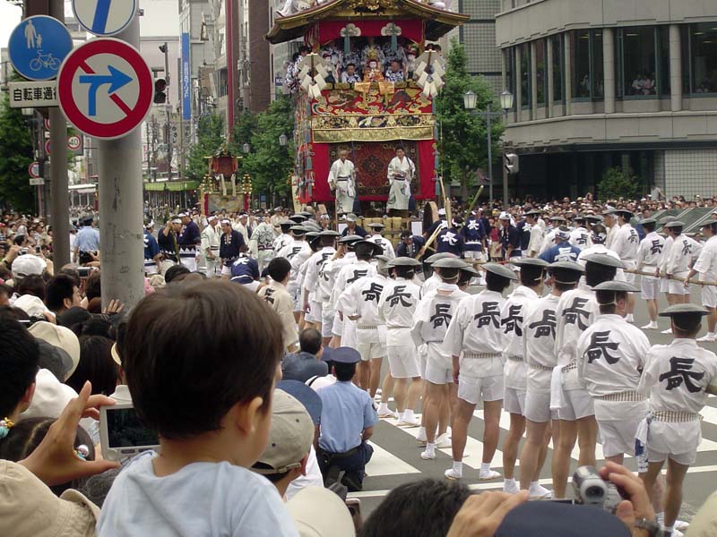 For 90-degree turns the process was a bit more difficult. First, the shrine would be pulled out into the middle of the intersection. Smooth bamboo husks are placed in front of the wheels to form a semicircle marking the turn-path for the front wheels. The shrine is then pulled forwards onto the moistened husks, the pullers swing the huge ropes around to the side, and drag it over the husks, sliding the front wheels sideways to complete the turn. It’s pretty amazing to see such a massive structure being dragged horizontally with a deep creaking moan, followed by the applause of thousands of spectators.