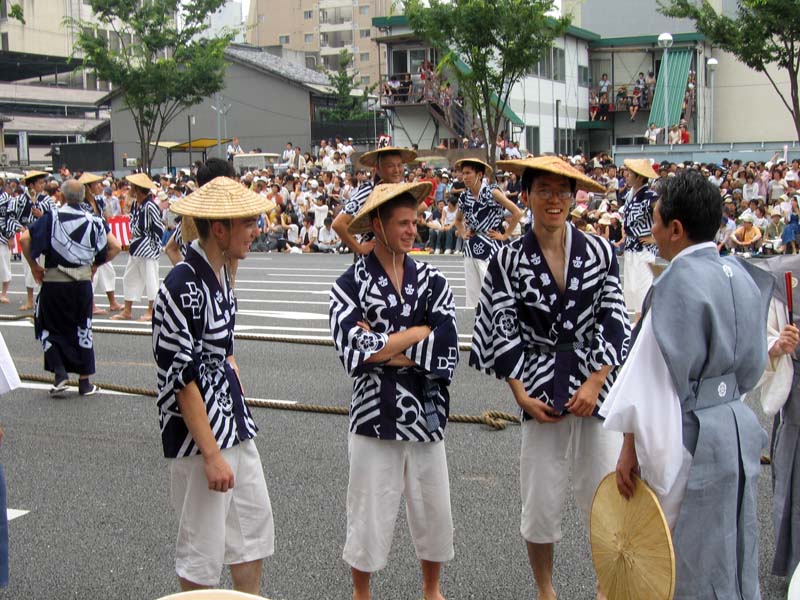 Now, fast forward to Sunday. We woke up at 6am to find that the weather was as perfect as it could be for a day of dragging several tons of wood half way across the city of Kyoto. Our float, one of the “yama”-class mikoshi, is among the largest sixteen of the ninety-something shrines that would participate in the Grand Procession, and one of the most famous. We quickly got changed into our traditional garb and rice-grass sandals and the pull was underway.