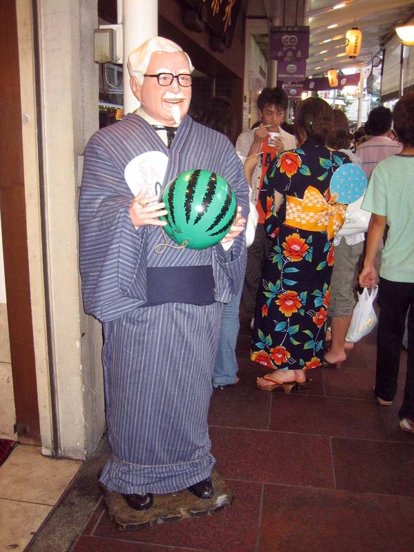 Peter Macintosh is a legend among those with an interest in Japanese culture. Since 1993 he has become the only gaijin to ever gain full access to the secret world of the geisha. He works with them, lives with them, socializes with them, and is the only one ever to be allowed to escort one out of Japan. He was issued a special license from the Japanese government to do so. When he showed up this morning, he smelled of alcohol and was complaining about a hangover from the night before. We later learned that the drinking took place at a party with his friends, the geisha. Such an experience would cost the average person, Japanese or not, as much as $1,500 for a few hours (not an exaggeration: check out the price list on his website). All day, whenever the parade would pass a geisha or maiko, he would greet them by name and they would do the same. He knew them all. Wow.
