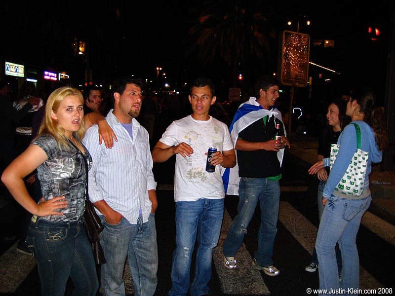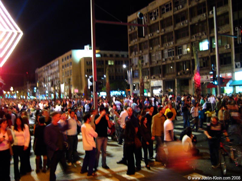 Once Peder had headed back to Turkey, Mike and I met up with Danielle, Alex, Mike, Sammy, Robbie, and Natalya and headed to Rabin Square for Israel’s 60th Independence Day celebration. It was Thursday evening, and the place was absolutely packed. Young kids running around spraying each other with canned foam (I got a bit soaked myself…d’oh), live music, and alcohol being consumed left and right. It reminded me in some ways of Mardi Gras in the Gaslamp District of San Diego – an urban outdoors street party in a blocked-off area of the city (for security reasons, the whole area was locked down tighter than LAX).
