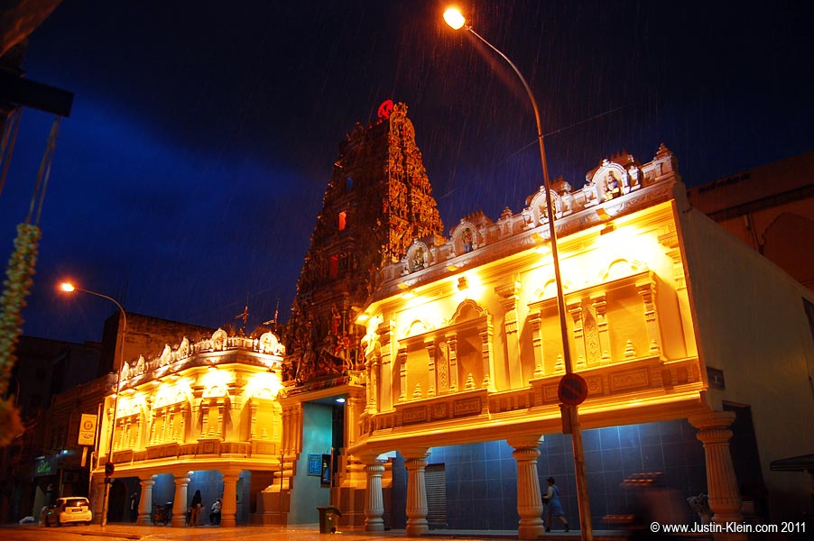 By the time the rain subsided it was just after dusk, which offered some unexpectedly colorful photo-ops at the nearby Sri Mahariamman Temple.