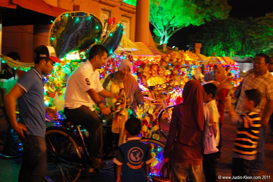 “These [trishaw drivers] seem to be competing for who can bedeck their vehicles in the most outrageously kitsch plastic flowers, semimacabre baby-doll heads, religious paraphernalia and tinsel. Add some flashing Christmas lights, a satin parasol and a sound system and you’ve got one proud peddler. While taking a ride in one of these things is the most high-profile β€˜I’m a tourist’ things you might ever do outside of Disneyland, it’s an unabashed hoot and is great support for an industry that is dying nearly everywhere else in the country. As a spectator, keep an eye out for big tourist groups hiring out trishaws en masse: the effect, with several ’80s dance hits blaring at the same time, cameras snapping and all that glitzy decoration, turns the streets of Melaka into a giant circuslike parade.